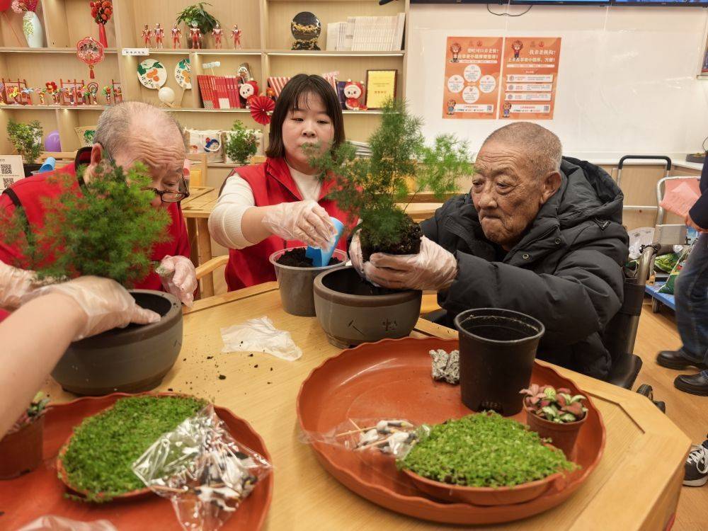 10月24日,在北京市丰台区北宫镇养老服务中心,志愿者正手把手教老人制作“松鹤延年”盆景。(新华社记者夏子麟 摄)