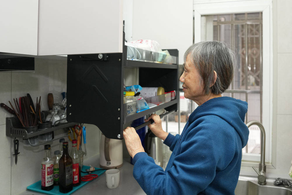 10月27日,浙江省杭州市西湖区北山街道宝石社区71岁居民毛小妹展示适老化改造后的厨房吊柜。(新华社记者黄宗治 摄)